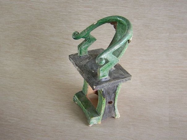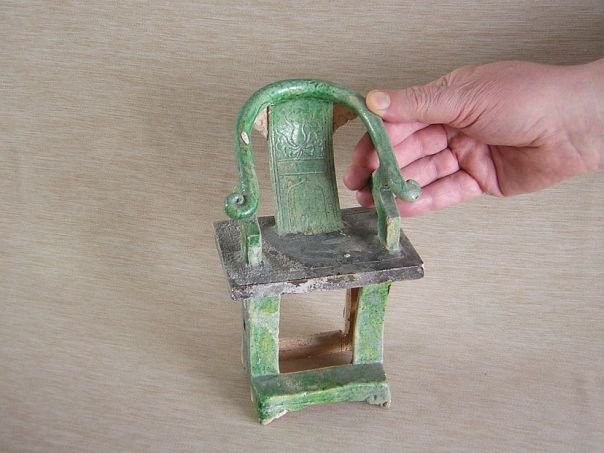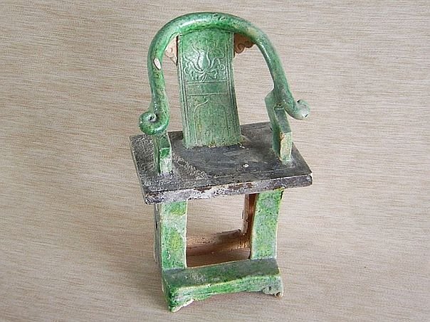Miniature pottery horseshoe chair, so called because the chair back is shaped like the iron protective covering under a horse hoof. The back of this green and amber glazed chair is decorated with a stylized lotus flower. The seat is cold painted in black. Ming period (1368 - 1644). Height 21.5 cm. Width 13 cm. Depth 11 cm. THIS ITEM WAS SOLD AT AUCTION IN 2022.
