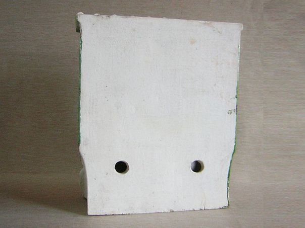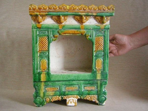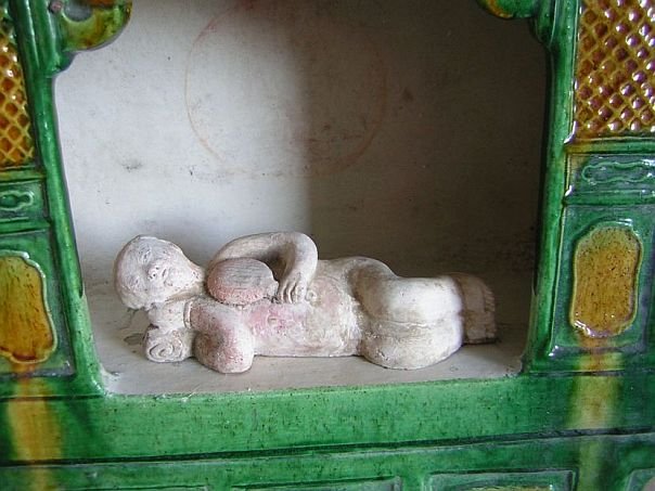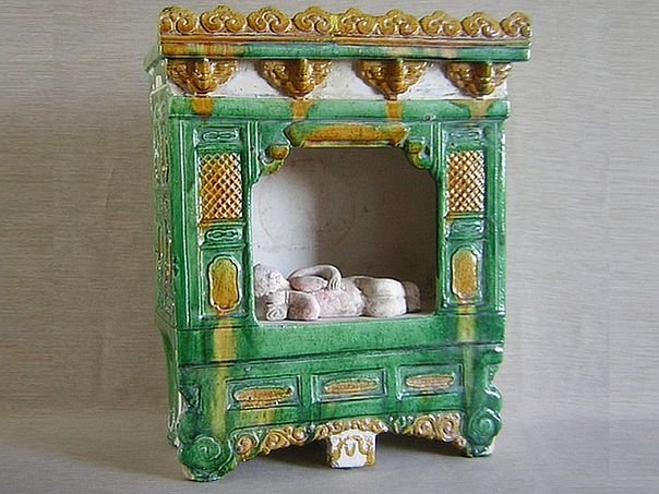 Massive bed glazed in green and amber. The interior shows remnants of some cold painting in red which possibly represents the sun. A man with a fan rests in the bed. When we acquired this bed, the dealer assured us that the figure came with the bed. This is very unusual and we have never seen anything like it before. The cold painted figure is definitely old. Ming dynasty (1368 - 1644). Height 43 cm. Width 34 cm. Depth 16 cm. THIS ITEM WAS SOLD AT AUCTION IN 2022.