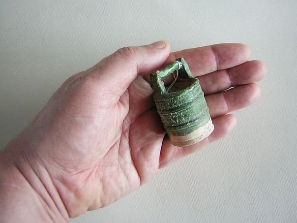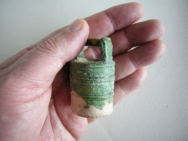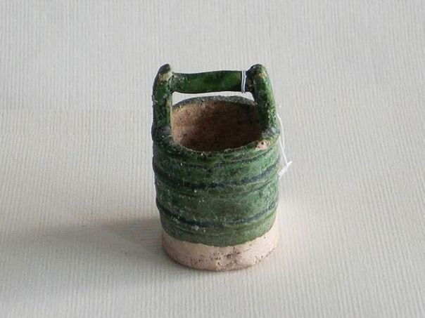 Miniature green glazed pottery bucket dating from the Ming period (AD 1368 - 1644). Height 5.6 cm. Diameter 3.5 cm. THIS ITEM WAS SOLD AT AUCTION IN 2022.
