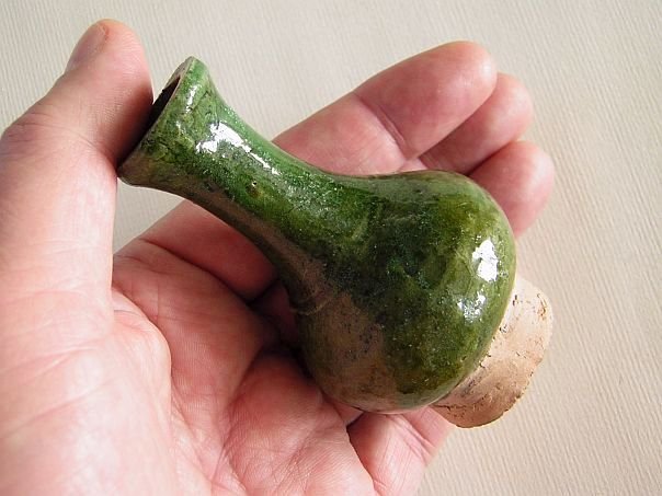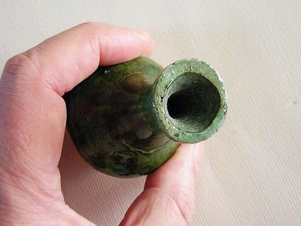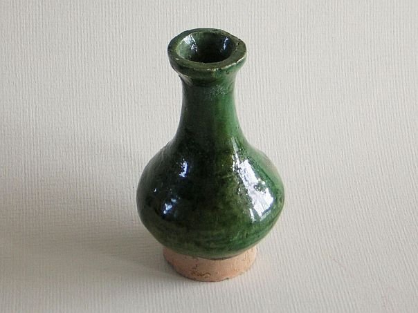 Miniature green glazed pottery vase. It has a slim neck and dates from the Ming period (1368 – 1644). Even though its condition is like new, this vase is more than 400 years old. Height 8.6 cm. Diameter 5 cm. THIS ITEM WAS SOLD AT AUCTION IN 2022.