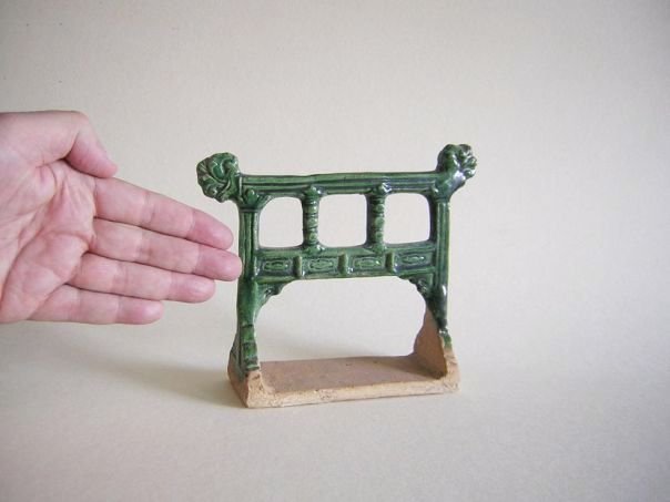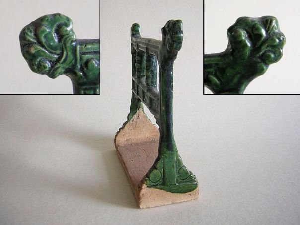 Miniature green glazed pottery rack used for hanging clothes. The corners at the top have floral decorations. The rack dates from the Ming period (1368 – 1644). Length top 17.5 cm. Length base 13.7 cm. Depth base 5.6 cm. This object is now owned by another collector. IT WAS SOLD AT AUCTION IN 2021.