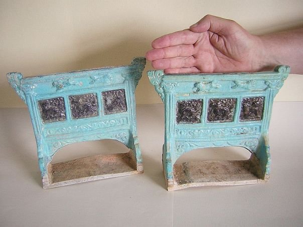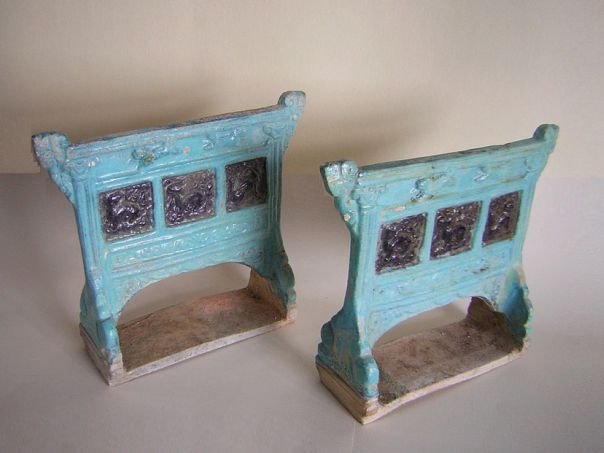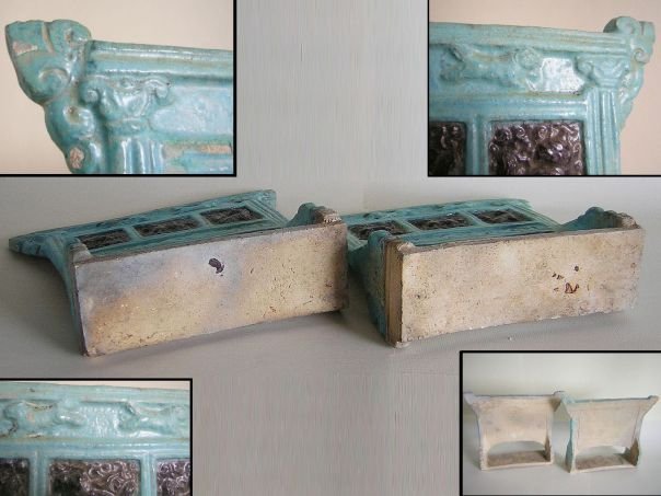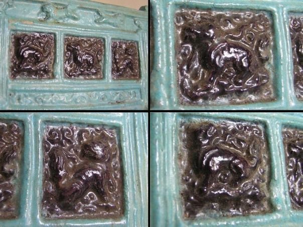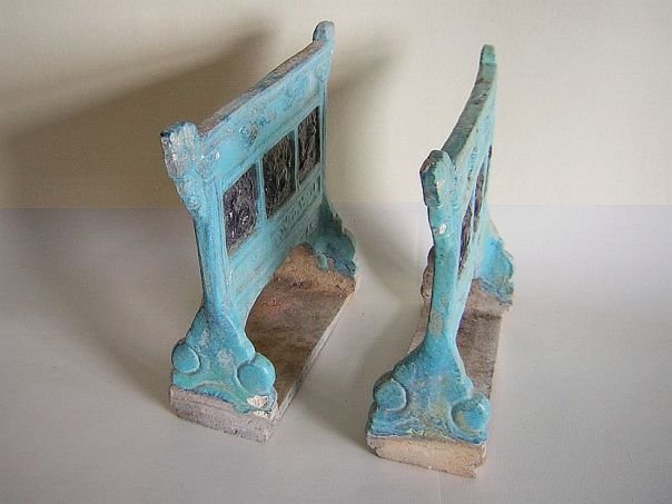 Pair of aubergine and light blue glazed pottery screens. On the front of each screen are three panels decorated with lions. The top part depicts two running lions. The back sides are unglazed. The lion was a symbol of Protection as well as High Rank. The pair is in good condition and dates from the Ming period (1368 – 1644). Width 24.3 cm. Height 22.1 cm. Depth 7.2 cm. Thickness 1.5 cm. THESE ITEMS WERE SOLD AT AUCTION IN 2022.