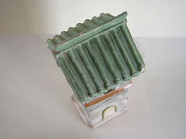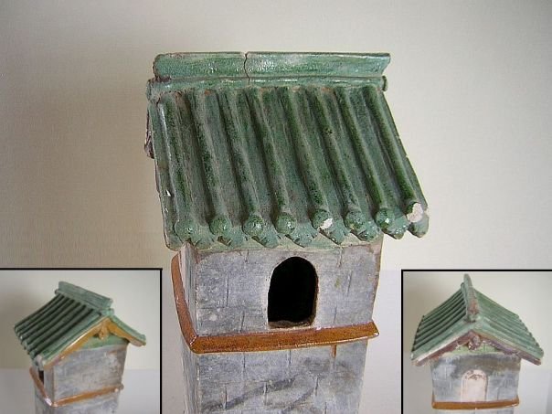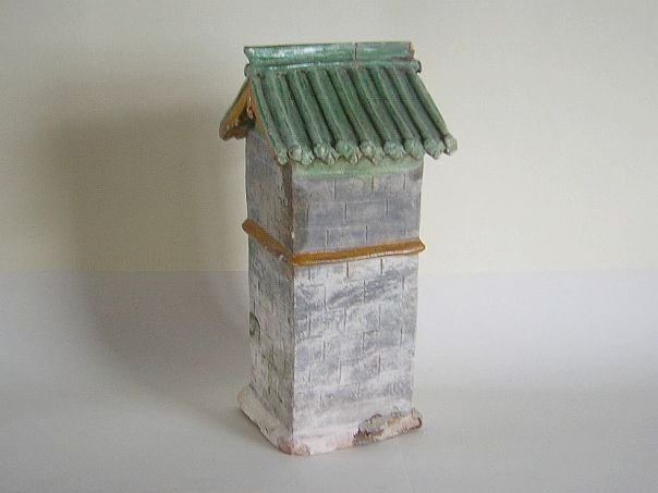 Miniature partly glazed model of a watchtower. The unglazed areas were cold-painted and some of the paint is still remaining. The colors dark brown, green and amber were used for the glazing. A watchtower is a rare occurrence in the world of miniature funerary objects. The condition of this one is good apart from some glaze fritters. It dates from the Ming period (1368 – 1644). Height 34 cm. Width tower 11.3 cm. Depth tower 13 cm. Roof width 16.7 cm. Roof depth 15.6 cm. Base 14 x 13 cm. THIS ITEM WAS SOLD AT AUCTION IN 2022.
