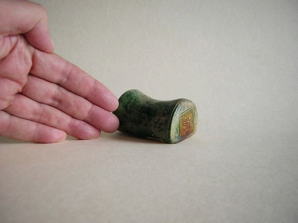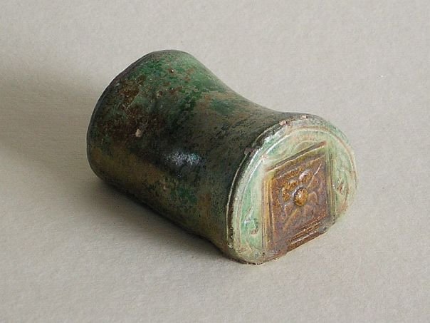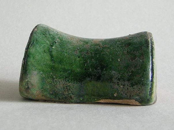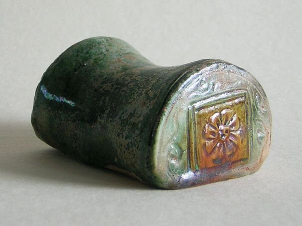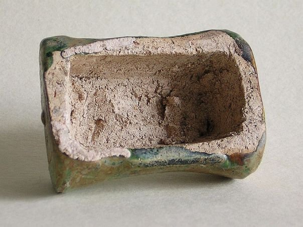 Extremely rare miniature glazed pottery model of a Chinese pillow. The colors are dark green and amber. The sides are decorated with flowers. It is in good condition and dates from the Ming period (1368 – 1644). Length 6.8 cm. Width 4.8 cm. Height 3.7 cm. THIS ITEM WAS SOLD AT AUCTION IN 2022.