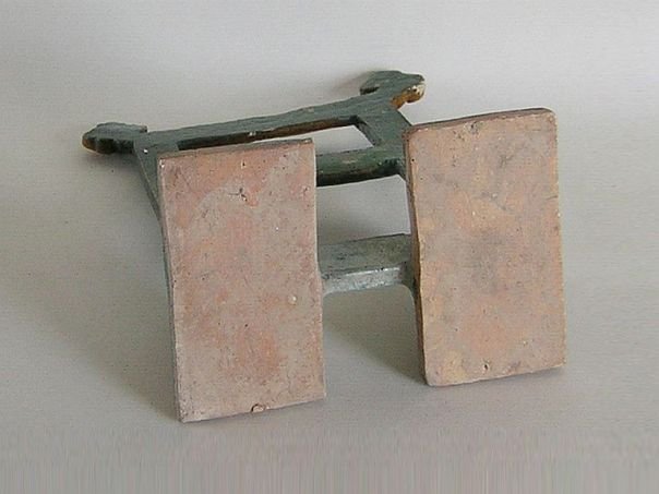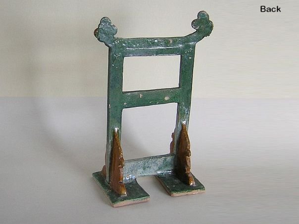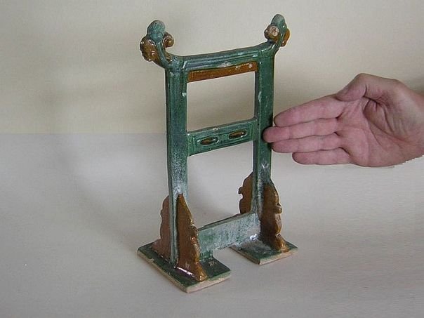 Miniature green and amber glazed pottery clothing rack. The top corners are decorated with a floral design. It is in good condition and dates from the Ming period (1368 – 1644). Height 27.4 cm. Width 15.4 cm. Depth 10.8 cm. Thickness 1.1 cm. THIS ITEM WAS SOLD AT AUCTION IN 2022.