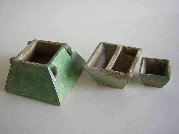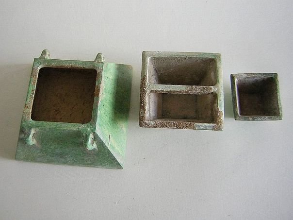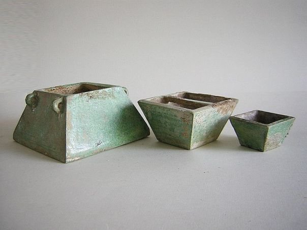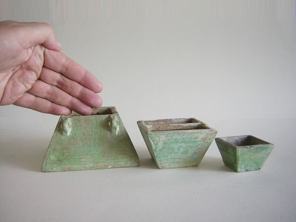 Set of three miniature green glazed pottery rice containers. These were used to transport and to measure quantities of rice. It is rare to find a complete set of three. They are in good condition and date from the Ming period (1368 – 1644). Large container: Height 6.2 cm. Base 11.4 x 11.4 cm. Middle container: Height 4.8 cm. Top 8 x 8 cm. Base 4.9 x 4.9 cm. Small container: Height 3.3 cm. Top 5 x 5 cm. Base 3.2 x 3.2 cm.