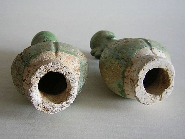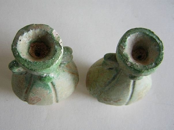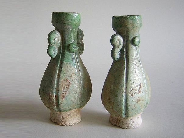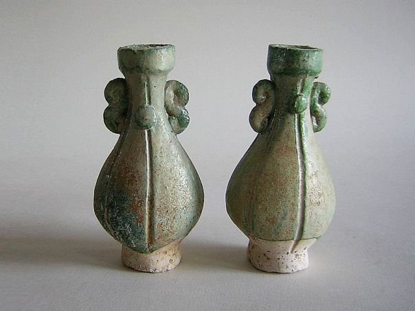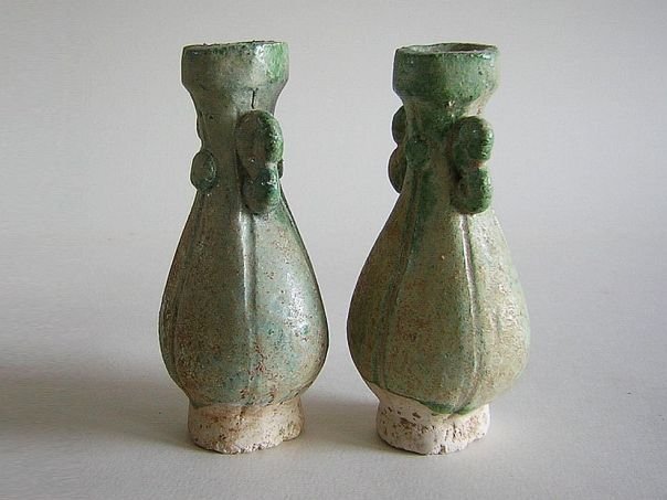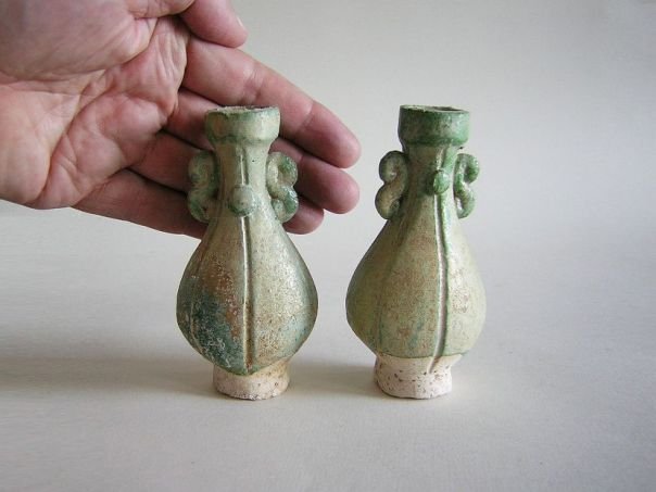 Pair of miniature green glazed pottery vases. The glaze has some iridescence. They are in good condition and date from the Ming period (1368 – 1644). Height 10.9 cm. Width 5.5 cm. Depth 4.4 cm. THESE ITEMS WERE SOLD AT AUCTION IN 2022.