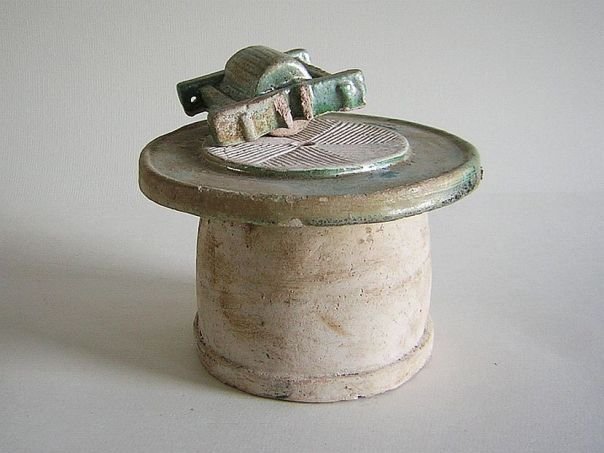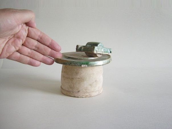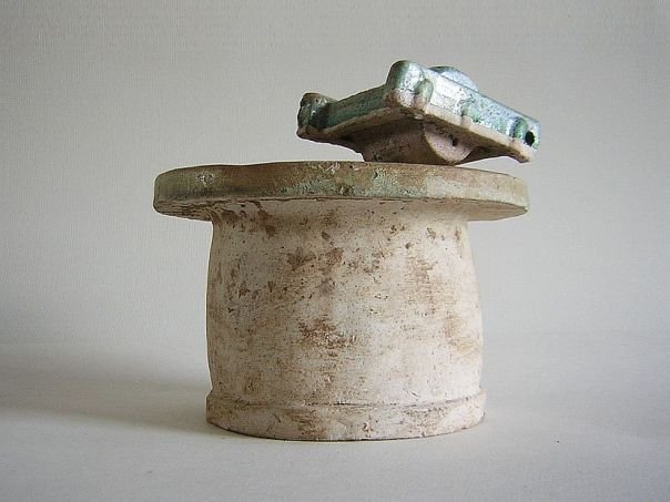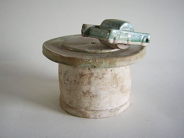 Miniature green glazed pottery model of a ‘table’ grain mill. Originally the roller had a loop on its side, now broken, which was attached to a wooden peg in the centre of the table. On the short side of the roller is hole through which a beam would be inserted so that the roller could be moved around. In real life the grain was poured on the rough central part and the stone roller would grind it. On the outer rim of the table is a flat space which would hold the ground flour and the husks. The glaze of the mill and roller have a nice iridescence. The mill dates from the Ming period (1368 – 1644). Table: Diameter top 13.4 cm. Diameter base 10 cm. Height 8.5 cm. Roller: Length 6.4 cm. Width 5.8 cm. Height 3.3 cm. THIS ITEM WAS SOLD AT AUCTION IN 2022.