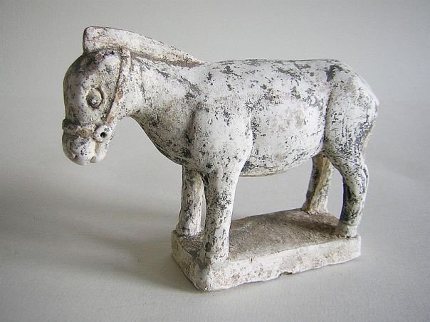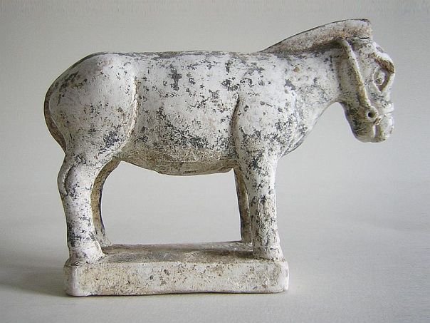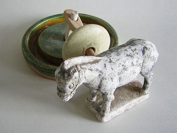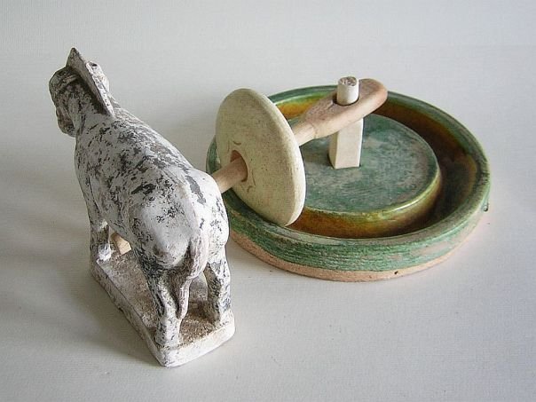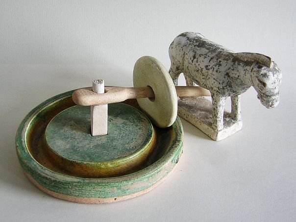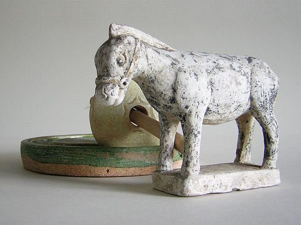Miniature pottery model of a grain mill covered in a green, amber and straw-colored glaze as well as a donkey which was originally cold-painted in black. A mill stone which is wheeled around by a donkey is a rare thing. Itβs just a pity that the top of the central pivot seems to have been broken off. The mill dates from the Ming period (1368 β 1644). Mill: Diameter 15.3 cm. Height 2.3 cm. Donkey: Length 13.5 cm. Width 4.3 cm. Height 10 cm. THIS ITEM WAS SOLD AT AUCTION IN 2022.