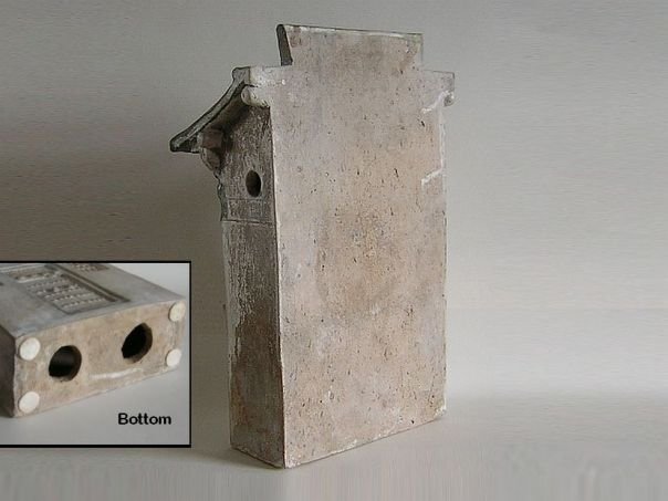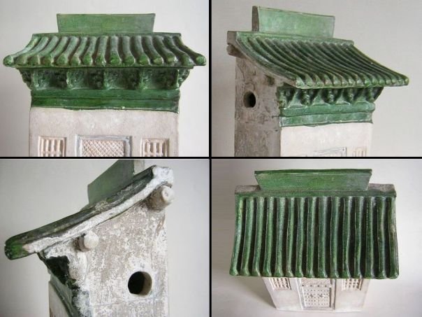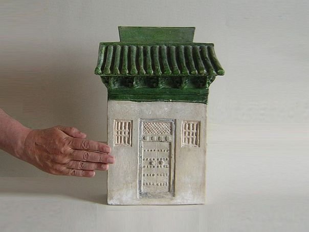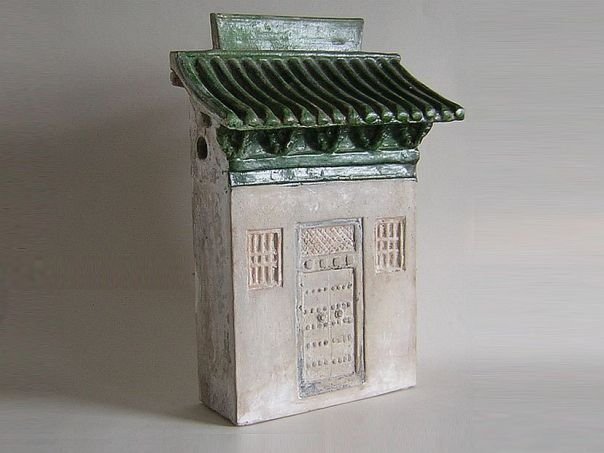 Partly glazed miniature model of a house. Types of this old house with its half roof can still be seen in China of today. The roof has been glazed in green while the rest of the house was originally cold-painted. It dates from the Ming period (1368 – 1644). Height 38 cm. THIS ITEM WAS SOLD AT AUCTION IN 2022.