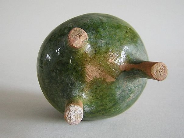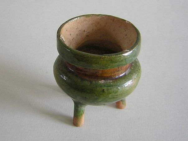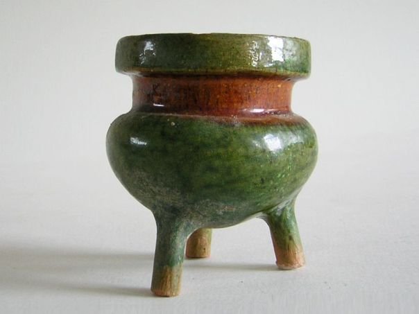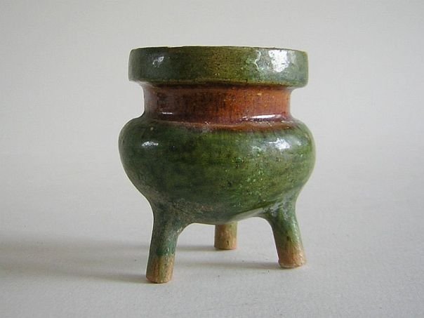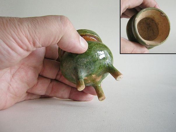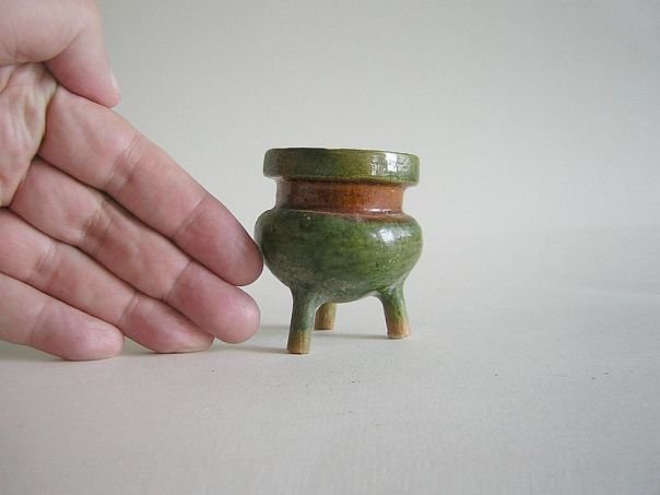 Miniature green and amber glazed vessel with three feet. Vessels like this had a sacrificial purpose and would be placed on an altar. Usually they were used to burn incense. This one is still in very good condition and dates from the Ming period (1368 – 1644). Height 6.3 cm. Diameter vessel 5.4 cm. Diameter rim 5 cm. THIS ITEM WAS SOLD AT AUCTION IN 2022.