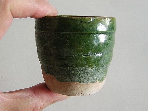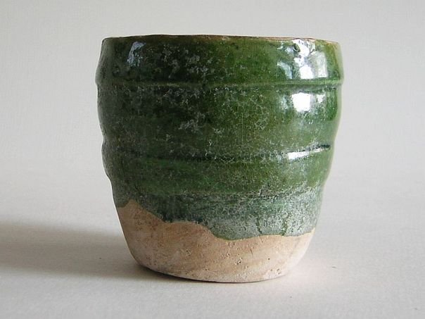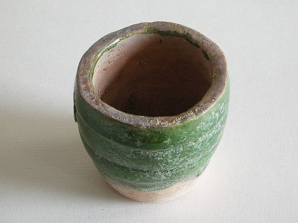 Miniature green glazed pottery model of a water vessel. Vessels such as this were filled with water to be used when there was a fire, which happened frequently because the houses were built of wood. In reality such vessels were quite large. Some bronze ones can still be seen in the Forbidden City in Beijing. This pottery one dates from the Ming period (1368 – 1644). Diameter rim 6.2 cm. Diameter base 4.5 cm. Height 5.9 cm. THIS ITEM WAS SOLD AT AUCTION IN 2022.