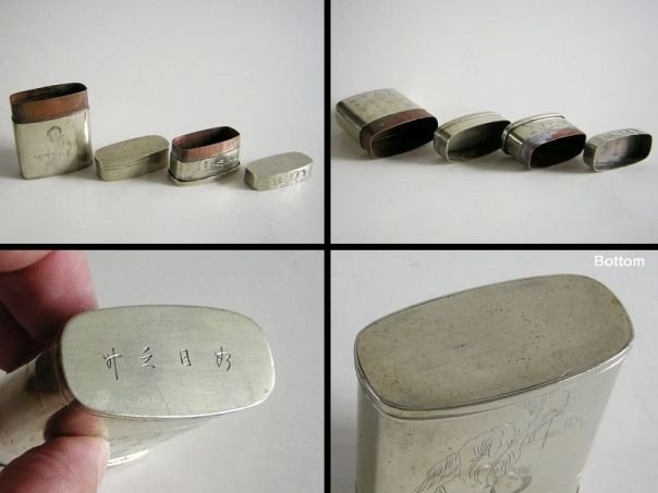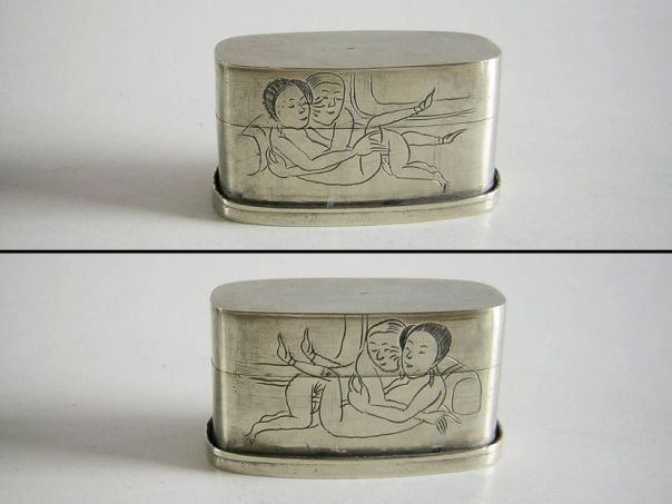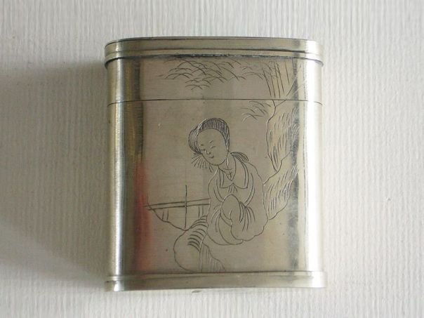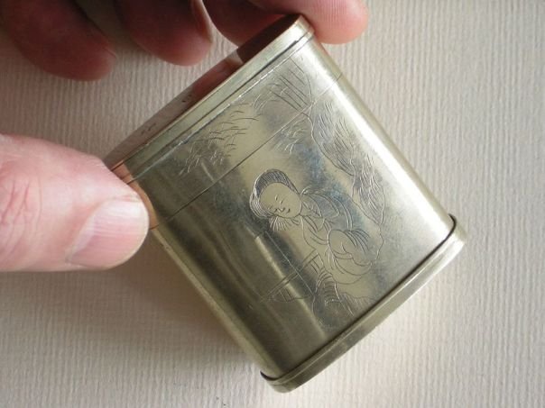 Opium box with a secret compartment in the bottom which is decorated with naughty engravings. The material from which it is made is called ‘Paktong’, ‘Baitong’ or ‘Nickel Silver’. Paktong (白銅) literally means ‘White copper’ and was used to imitate sterling silver. In fact it contains about 60% copper, 20% nickel and 20% zinc and no silver at all unless it is silver-plated. It was first known in China during the Qing period (1644 – 1912) before it became fashionable in the West. The opium box is decorated on the front with a sweet scene of a pretty lady and there’s a poem on the back. The top has an engraved inscription which reads ‘ru ri zhi sheng’ (如日之升) which means ‘May you be successful in getting official promotions continuously’. The opium box dates from the Qing period. Height 5.2 cm. Width 4.6 cm. Depth 2.2 cm.