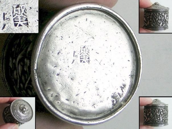 Embossed silver opium box decorated with magpies and plum blossoms. The combination of the two forms the rebus ‘xi zai mei shao’ which means ‘Happiness to one’s eyebrows’. The lid shows a depiction of a bat (fu) symbolizing ‘Blessings’. The workmanship on this box is quite detailed. On the bottom is a hallmark with the name of the silver smith which we read as ‘Cheng’. The box dates from the end of the Qing dynasty (1644 – 1912). Height 3.5 cm. Diameter 3.3 cm.
