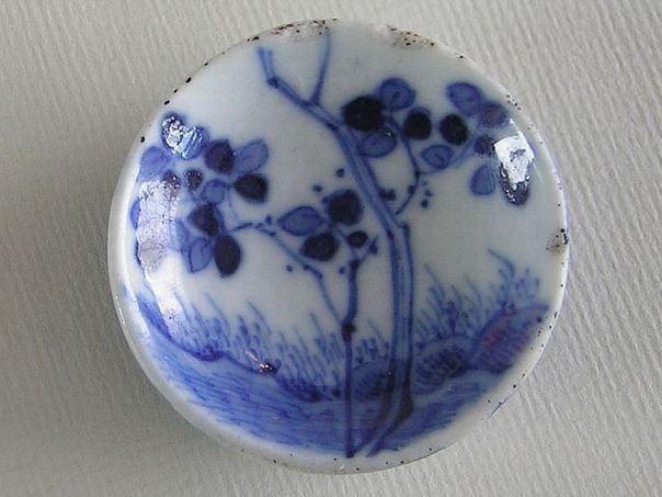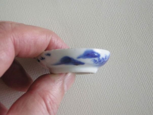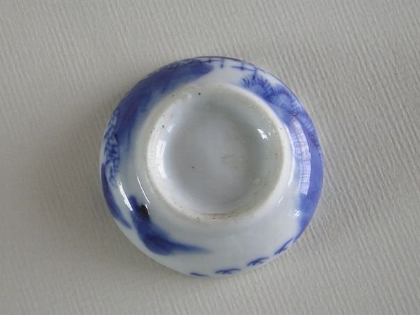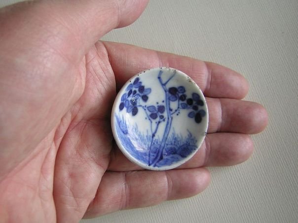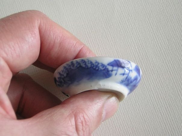 Small porcelain dish which was used for serving snuff tobacco. Snuff was in fact pulverized tobacco which would be sniffed up to create a tickling sensation in the nose usually followed by a sneeze. The use of snuff was especially en vogue during the 19th century. The dish is hand-painted in blue with a young blossoming tree. It came from a friend in 2013 and dates from the late Qing period (1644 - 1912). Diameter 4.8 cm. Height 1.4 cm.