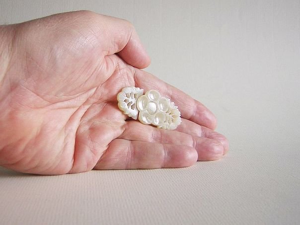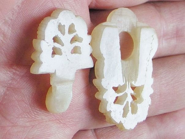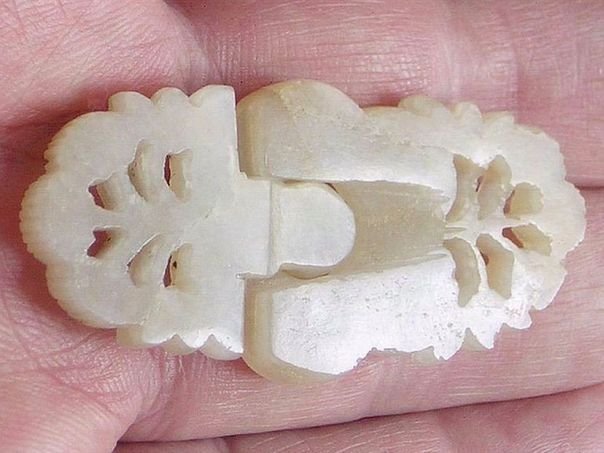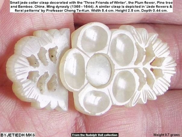 Jade collar clasp decorated in openwork with the ‘Three friends of winter’, the Plum Flower, the Pine Tree and Bamboo. The Pine tree and the Bamboo remain green even in icy winters while the Plum is the first to bloom every year. They are admired for their resistance to the elements, symbols of Longevity and highly regarded in Confucianism. As such they represent the scholar-gentleman's ideal. A very similar clasp such as this is depicted in ‘Jade flower and floral patterns’ by Professor Cheng Te-Kùn. Our clasp dates from the Ming dynasty (1368 – 1644 AD) and was previously in the possession of Rudolph Voll (1911-2009) who acquired it in the 1970’s in Hong Kong. For more information on Rudolph Voll see Quick Find 4167.