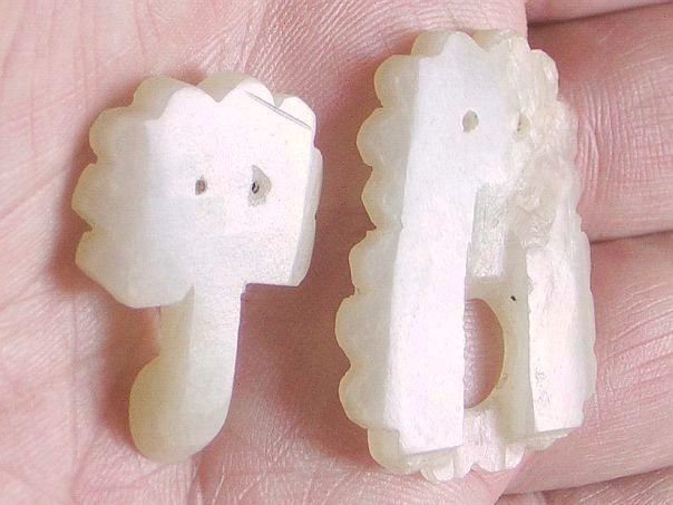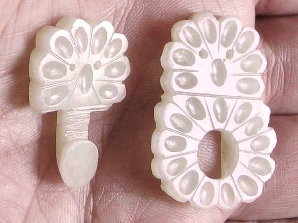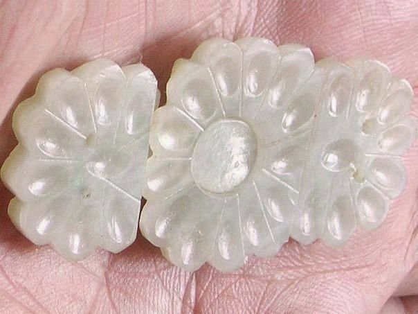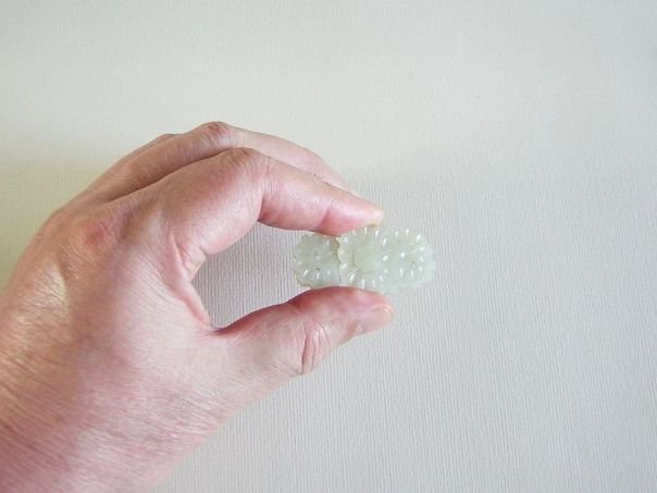 Jade collar clasp which was used to close the high collar of a ladies dress. It is decorated with three chrysanthemum flowers. The Chrysanthemum flower is a symbol of Longevity because of its health-giving properties. The clasp dates from the Ming period (1368 – 1644 AD) and was previously in the possession of Rudolph Voll (1911-2009) who acquired it in the 1970’s in Hong Kong. For more information on Rudolph Voll see Quick Find 4167.