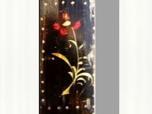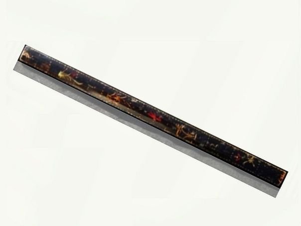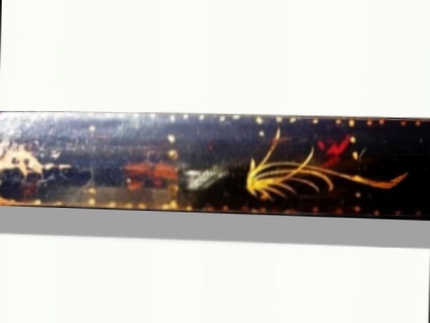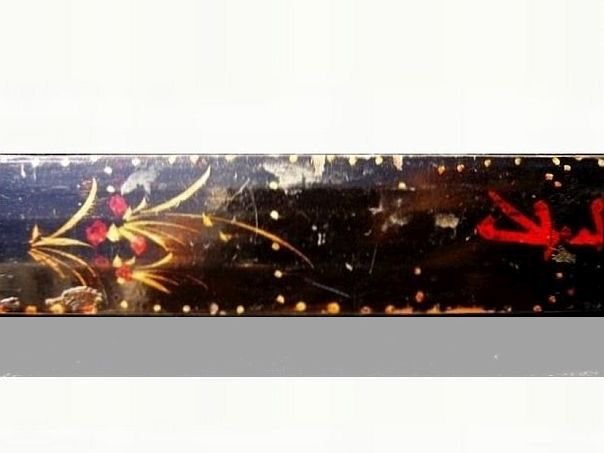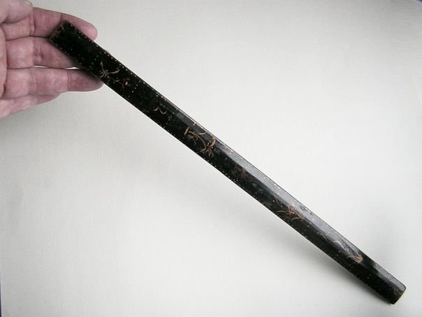 Lacquered wooden ruler decorated in gold with flowers. The division does not tally with Western sizes such as inches or centimeters. Instead traditional units of measure were customary. Many of the units were formerly based on the number 16 instead of 10. Small rulers like this were used for home crafts such as sewing children’s clothing, collars, head gear and other garments. The ruler dates from the end of the Qing period (1644 – 1912). Length 35.5 cm. Width 2.0 cm. Thickness 0.4 cm.