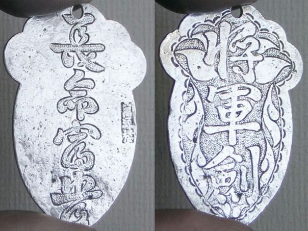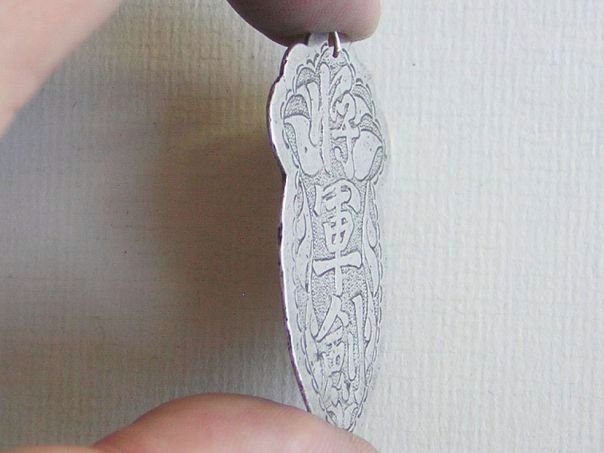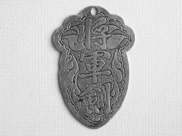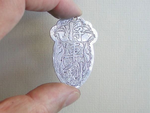 Silver amulet in the shape of a shield engraved on one side with the characters ‘Jiang Jun Jian’ (General’s sword) and on the other with the characters ‘Chang Ming Fu Gui’ (Long Life and Prosperity). Which general is meant, is unknown to us. Perhaps the inscription refers to the famous general Guo Ziyi who was the embodiment of Longevity, Wealth and Honor. Certain is that the sword serves as a protection against evil. The amulet is hallmarked and dates from the Qing period (1644 – 1912). Height 4.8 cm. Width 3.2 cm. Depth 0.1 cm.