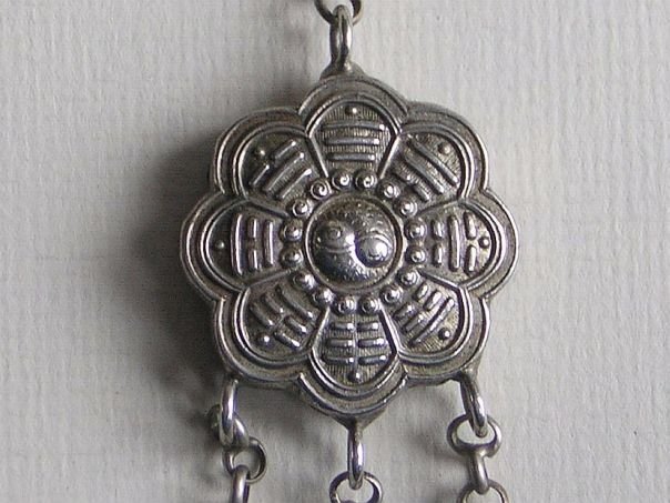 Silver grooming set with a flower-shaped medallion decorated on one side with the Eight ‘Trigrams’ (See Quick Find 4139) and a Yin Yang symbol and on the other side with a 'profession' amulet (See Quick Find 0289). The hook is decorated with flowers. There are three ‘tools’, a tongue scraper, an ear scoop and a toothpick. The tongue scraper which was used to clean one’s tongue is embossed with an unknown flower. The grooming set is not hallmarked and dates from the end of the Qing period (1644 – 1912) to the early Republic period (1912 – 1947). Total length 49 cm. Amulet diameter 2.6 cm. Depth 0.8 cm.