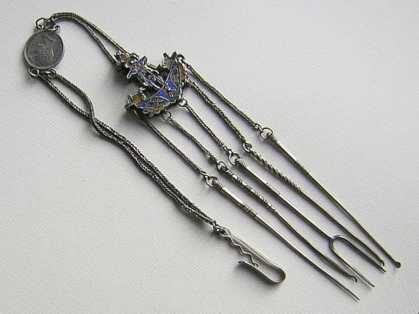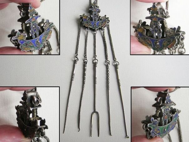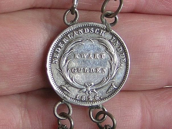 Silver grooming set which incorporates a silver ‘quarter guilder’ from the Dutch East Indies (Indonesia). The coin is dated 1826 and shows the image of King Willem I of the Netherlands on the other side. Indonesia, or ‘Nederlandsch Indië’ as it was called by the Dutch was a colony of the Netherlands until Indonesia’s independence in 1945. An enameled boat with two small sailors inside is attached to five ‘tools’, consisting of an ear scoop, a fork and three picks. The unusual ornamentation of this grooming set indicates that it dates from the 19th century. Total length 38.5 cm. Boat size: Height 3.6 cm. Width 3.6 cm. Depth 0.9 cm.