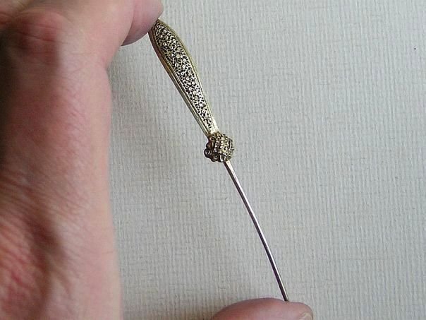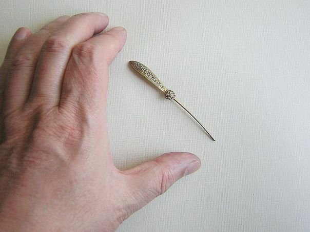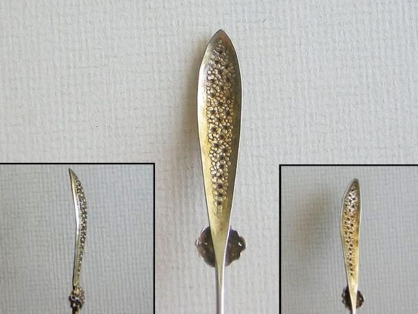 Very small gilt silver hairpin in openwork decorated with Plum flowers of which the five petals represent the Five Blessings (see 4093) and an Endless Knot (Happiness & Long Life). The workmanship on this tiny gem is very fine. It dates from the end of the Qing (1644 – 1912) to the early Republic period (1912 – 1947). Length 8.2 cm. Width 0.8 cm. Depth 0.3 cm.