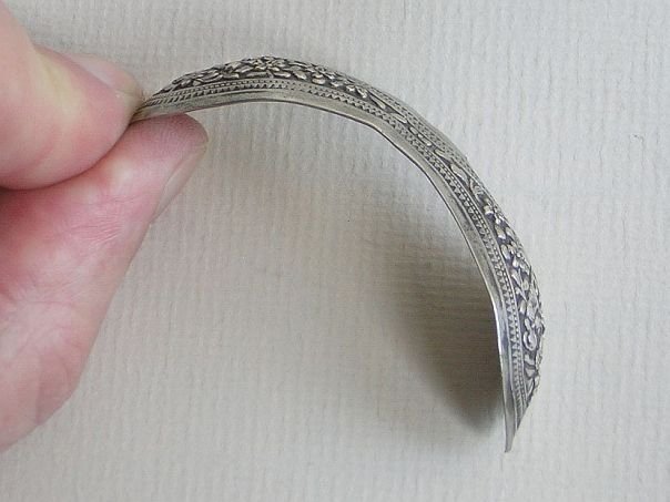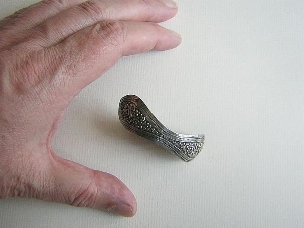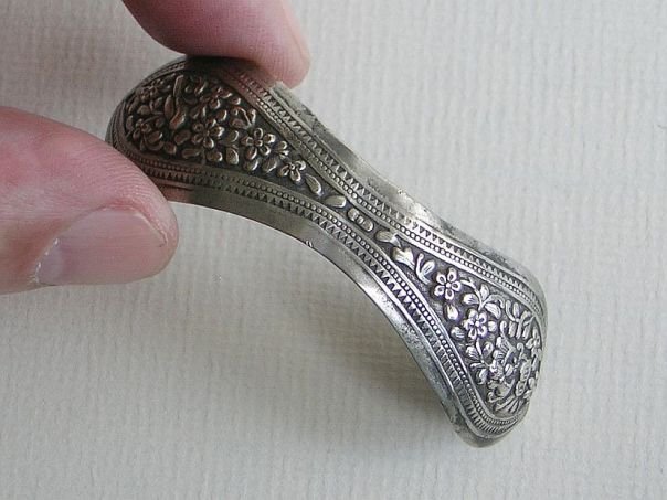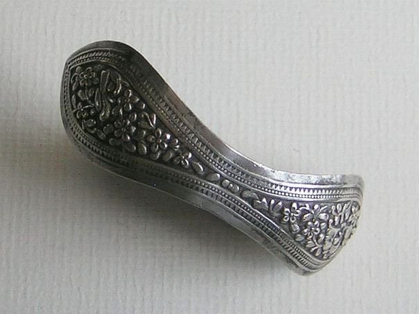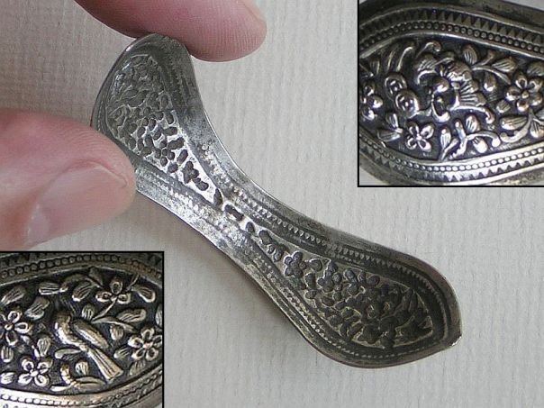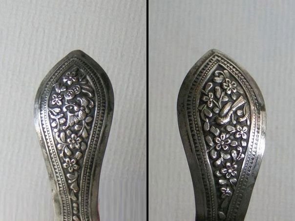 Silver spoon-shaped hairpin which is decorated in great detail with butterflies, plum blossoms, two coins and a magpie. Plum flowers represent the Five Blessings (see 4093) whereas butterflies symbolize Blessings & Happiness. A magpie symbolizes Joy & Happiness. Coins (Wealth) with their square openings are sometimes called ‘Coins with eyes’ which leads to the pun ’Blessings and joy right before your eyes’. The hairpin dates from the end of the Qing (1644 – 1912) to the early Republic period (1912 – 1947). Length 5.8 cm. Width 1.9 cm.