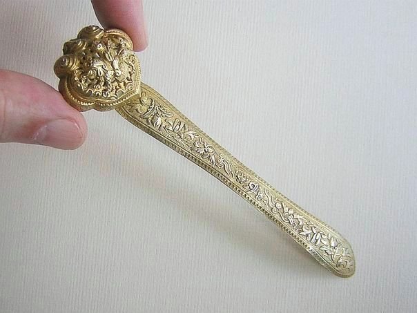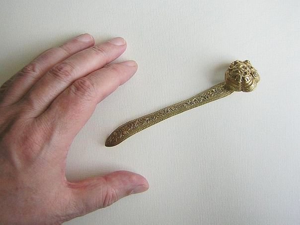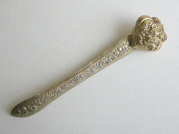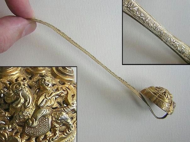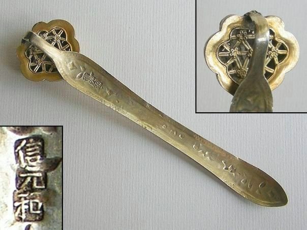 Heavily gilt silver hairpin of the ‘ruyi-type’ which is embossed in openwork with a boy sitting on a saddled creature called a ‘Qilin’. A ‘qilin’ is a mythological animal with the body of a deer with scales, the tail of an ox, hooves of a horse and antlers, which had the same role as the stork (which delivers babies) in the Western world. A boy riding a qilin is a pun for ‘May the Qilin bring you a son’ (qilin songzi). The boy has a Ruyi scepter in his hand which symbolizes that everything a person wishes for will come true. A decoration on the top looks like a bat which represents Blessings & Riches. The ‘stem’ of the hairpin is decorated with Peaches (Longevity), Cymbidium blossom (Friendship & Grandchildren), Bats (Blessings & Riches) and Plum flowers which with their five petals represent The Five Blessings, Wealth, Health, Longevity, Love of Virtue and a Peaceful Death. The back side of the top part is also decorated with Plum flowers in openwork. The hairpin is marked Xin Yuan He (信元和 ) who may have been the silversmith or retailer and dates from the end of the Qing (1644 – 1912) to the early Republic period (1912 – 1947). Length 13 cm. Width 3 cm.