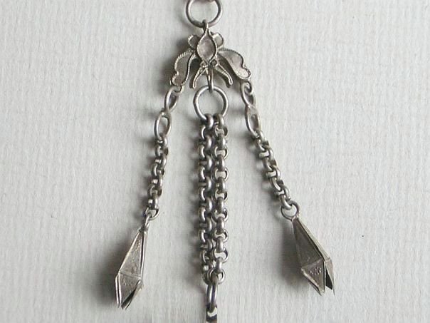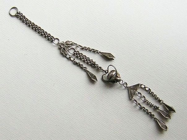 Extremely fine silver charm chain which used to dangle from a long hairpin. It is more than likely that the objects attached to this charm chain were once adorned with the bright blue feathers of the Kingfisher bird but these are gone. Depicted are a Musical stone (qing) which is a pun for ‘Celebrate’ or ‘Auspicious Happiness’, a Butterfly (Blessings & Happiness) and a Basket (Longevity & Abundance). Each side of the basket is decorated with an Osmanthus flower (Distinguished sons). The charm chain dates from the end of the Qing Dynasty (1644 – 1912). Length ca 15 cm.