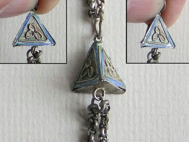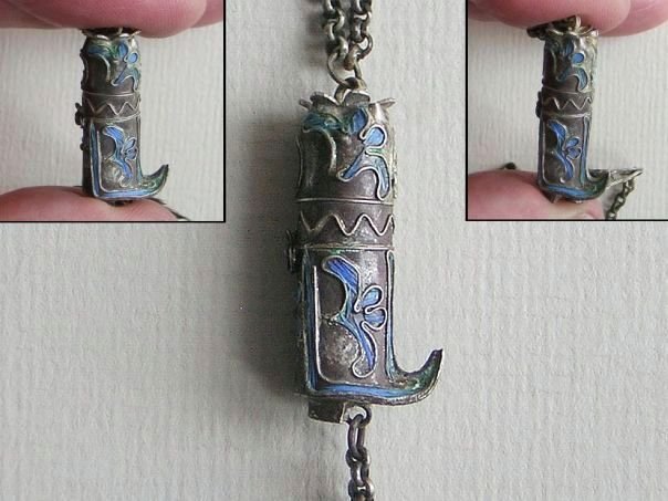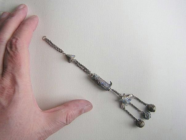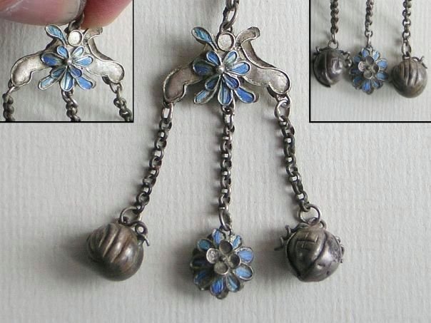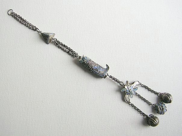 Extremely fine silver charm chain which used to dangle from a long hairpin. Depicted are a boot, a triangular shape and an unknown object with a flower. Originally these items were completely adorned with the bright blue feathers of the Kingfisher bird but most of these are gone. Shoes (xiezi) are a pun for ‘Together’ (xie). At the bottom is an unknown object, perhaps a Butterfly (Blessings & happiness), a Chrysanthemum flower (Longevity) and two bells shapes as rudimentary Peaches (Long Life). The charm chain dates from the end of the Qing Dynasty (1644 – 1912). Length 15.5 cm.