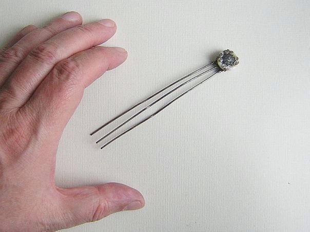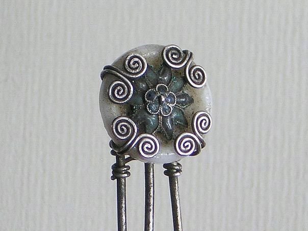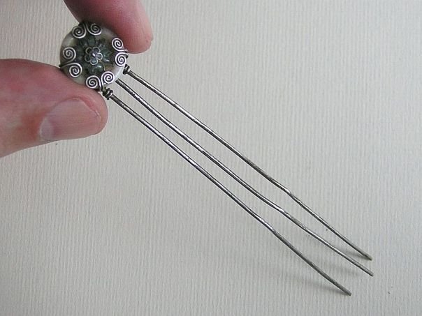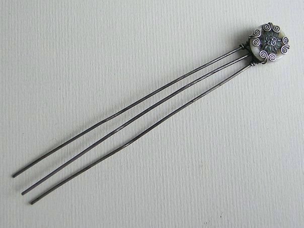 Three-pronged silver hairpin decorated with a white glass disc embellished with an enameled plum flower in the centre. A plum flower has five petals which symbolize the Five Blessings, Old age, Good Health, Wealth, Love of Virtue and a Peaceful death. The hairpin dates from the late Qing (1644 – 1912) to the early Republic period (1912 – 1947). Length 11.3 cm. Width 1.5 cm.