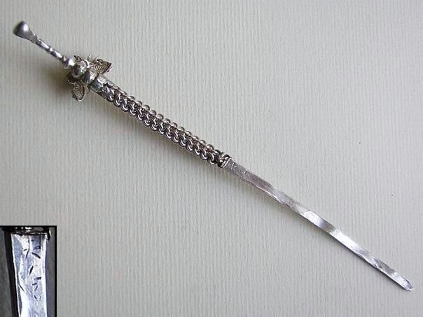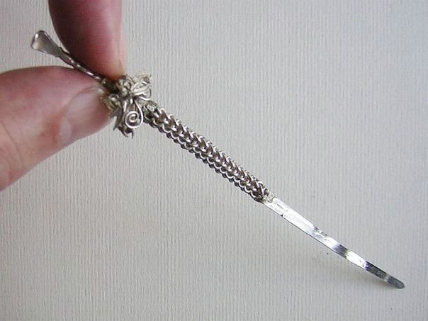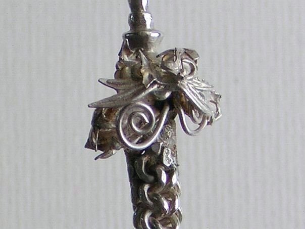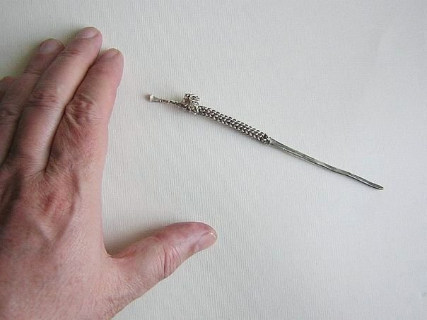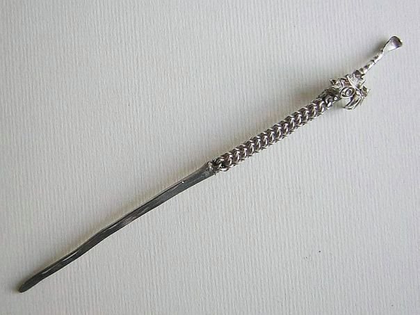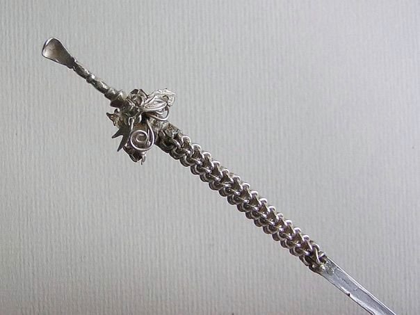 Silver hairpin with a twined stem. The top is decorated with a Butterfly (Blessings & Happiness) and an ear scoop. It is marked but we can only decipher the first character ‘Tian’ (天). The hairpin dates from the late Qing (1644 – 1912) to the early Republic period (1912 – 1947). Length 14.2 cm. Width 1.7 cm.