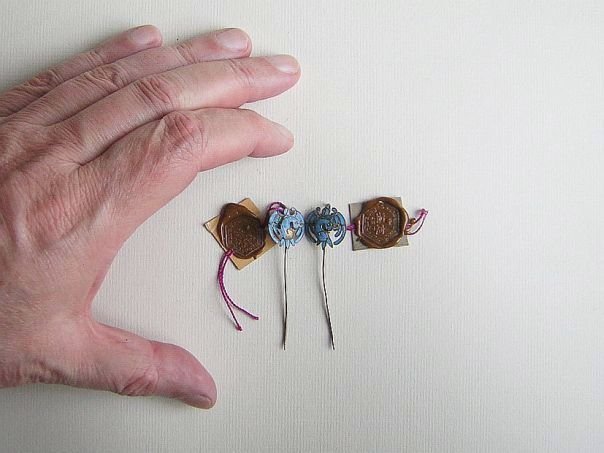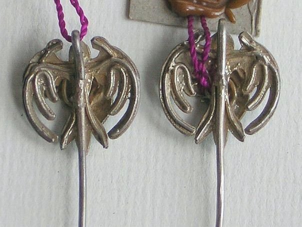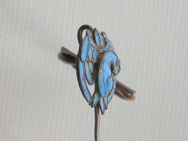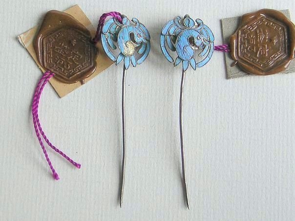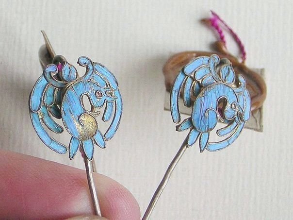 Pair of small gilt silver hairpins decorated with birds which have been inlaid with Kingfisher feathers. We don’t know what kind of bird is depicted. The hairpins date from the late Qing (1644 – 1912) to the early Republic period (1912 – 1947). Length 5.7 cm. Width 1.7 cm.