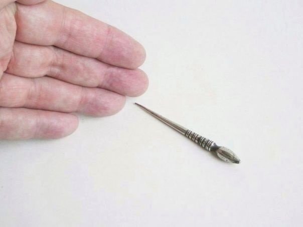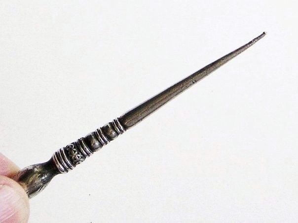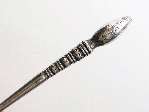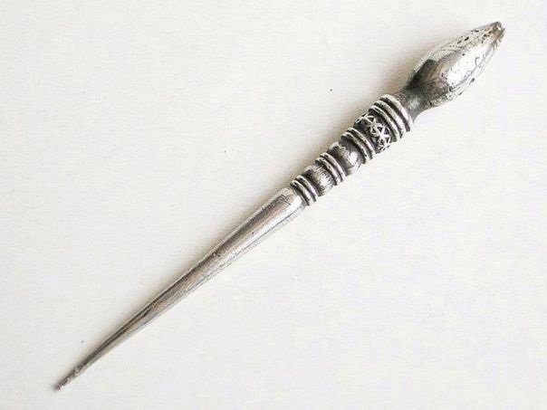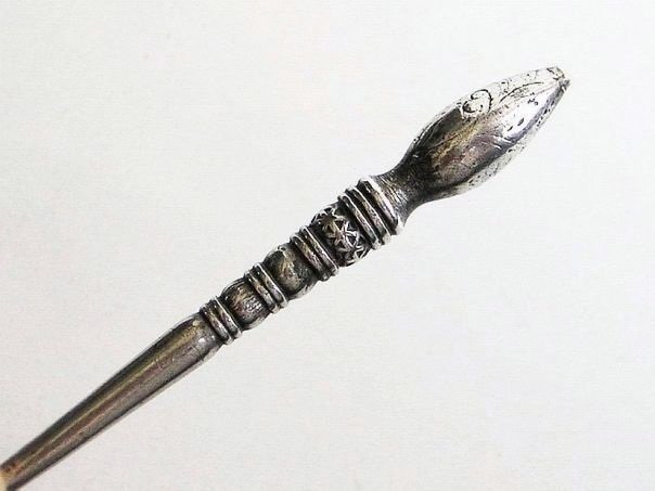 Simple silver hairpin with a cone-shaped top which is decorated with engraved and hammered patterns. One depicts a flower, most probably a plum flower, which has five petals symbolizing the Five Blessings, Old age, Health, Wealth, Love of Virtue and a Peaceful death. We have not been able to find a silver mark on this hairpin which is still in excellent shape. It dates from the late Qing (1644 – 1912) to the early Republic period (1912 – 1947). Length 7.3 cm. Diameter 0.7 cm at the top. Weight 8.8 grams.