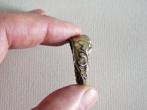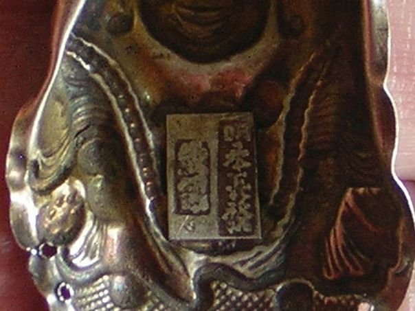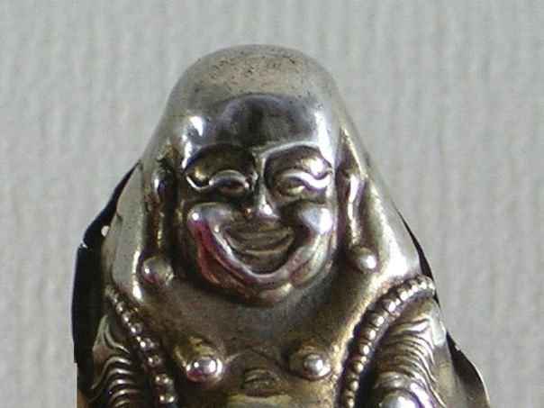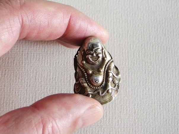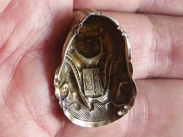 Gilt silver hat ornament in the shape of ‘Putai’ (Smiling Buddha). Putai or Budai is usually identified as an incarnation of Maitreya, the future Buddha, so much so that the Putai image is one of the main forms in which Maitreya is depicted in Asia. Rubbing his belly is supposed to bring Wealth, Good Luck and Prosperity. There is a tiny plaque with Chinese hallmarks inside mentioning that it is made of silver ‘Wen Yin’ (纹银) and the characters ‘Ming Yong Chang Fa’ (明永长發) which may be a name. Most of the gilding is rubbed. The ornament dates from the Republic Period (1912 – 1947). Height 3.3 cm. Width 2.3 cm. Depth 1.4 cm.