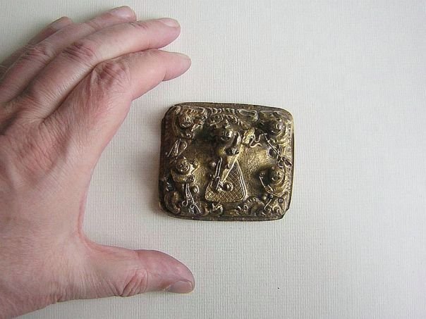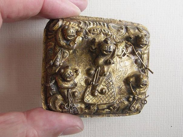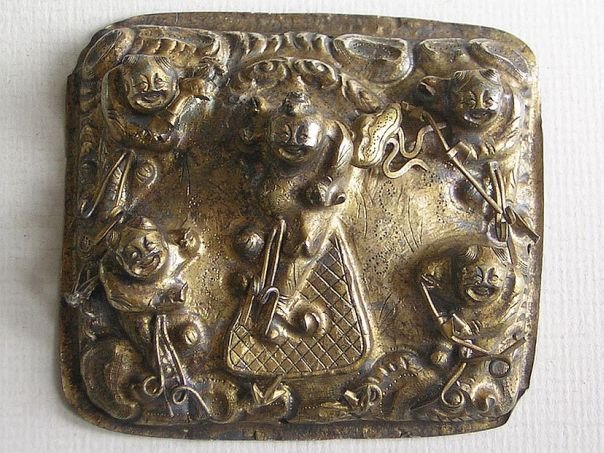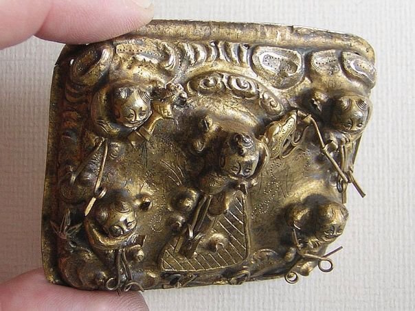 The ‘Five Boys’ theme was quite popular during the Qing Dynasty. Depicted on this gilt silver hat emblem are the five sons of Dou Yujun, who during the Period of the Five Dynasties (907 – 960), was a scholar and official. His five sons were very successful during the Civil Service Examinations and became high officials. Therefore their depiction symbolizes the wish to achieve a high position. The emblem dates from the Qing Dynasty (1644 – 1912). Width 6.8 cm. Height 6.2 cm. Depth 2.5 cm.