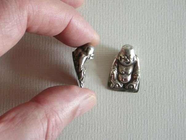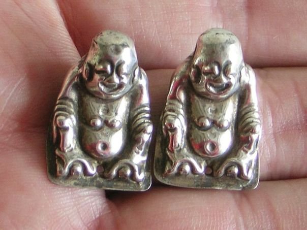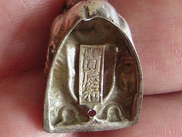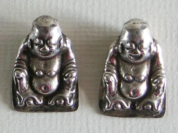 Two small silver hat ornaments both depicting the ‘Laughing Buddha’ or Putai. Originally they may have belonged to a larger set. Putai is traditionally depicted as a fat-bellied bald man wearing a robe and playing with prayer beads. He is poor but content and his image graces many Chinese temples, restaurants, shops and amulets. The hat ornaments are marked at the back Tong Qing He (同慶和) which may have been the silversmith or retailer. The two small characters on top cannot be deciphered. The ornaments date from the late Qing (1644 – 1912) to the early Republic period (1912 – 1947). Height 2.5 cm. Width 1.7 cm.