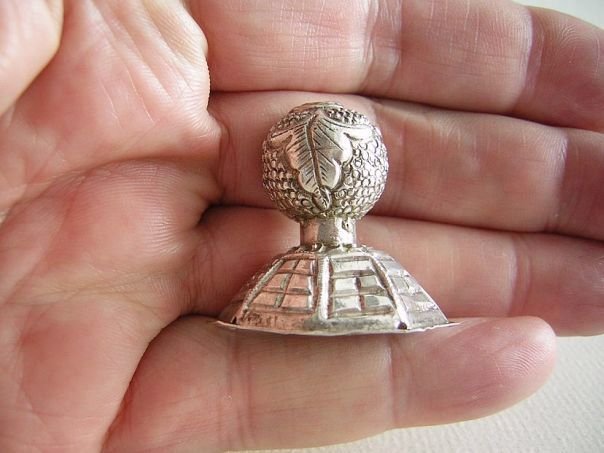 Silver hat knob for a child’s hat. The top is shaped as a flower bud and it has an octagonal base decorated with the Eight Trigrams (Pa Kua or Ba Gua). For an explanation of the ‘Pa Kua’ which were used in divination see Quick Find 4139. The hat finial dates from the Republic period (1912 – 1947). Height 3.2 cm. Width 3.1 cm.