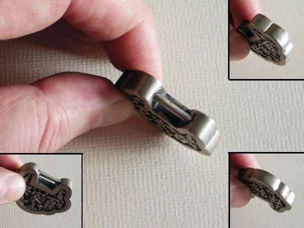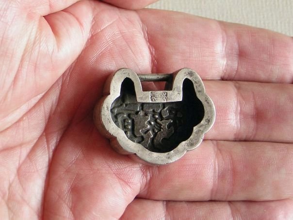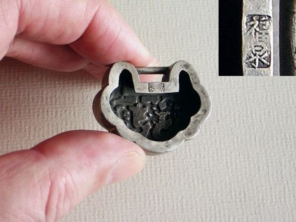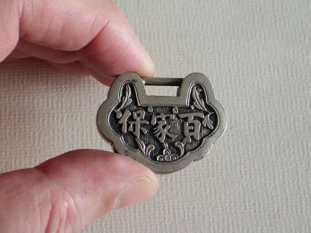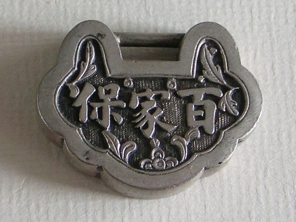 Small silver lock with the text ‘protection from a hundred families’ (bai jia bao). When a child was about three months old, it was usually given a silver, gold or jade amulet in the shape of a lock in the hope that the lock would tie the child down to prevent abduction by evil spirits. In some areas of China money would be donated by a hundred families to purchase a silver lock and consequently the child would then have the protection of these hundred families. This is such a lock. It has an open back but is of very nice quality. The lock is marked Fu Quan ( 福泉) which may have been the silversmith or the retailer. It dates from the late Qing Dynasty (1644 – 1912). Width 3.8 cm. Height 3.0 cm. Depth 0.7 cm. Weight 10.0 grams.