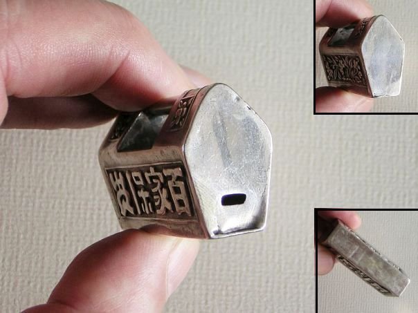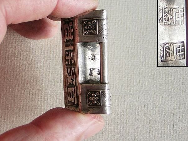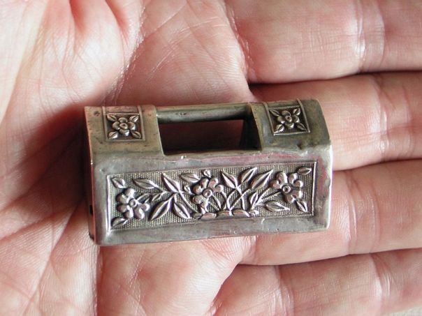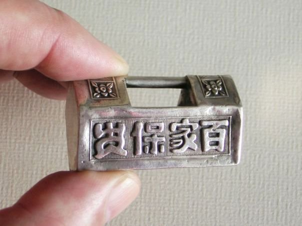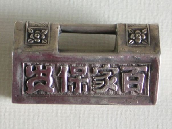 Silver lock decorated on one side with yet undefined flowers. Osmanthus flowers (Distinguished sons) are depicted on the top. On the other side of the lock is the text ‘Bai Jia Bao Suo’ (百家保锁) which means ‘Protected by a hundred families’. When a child was about three months old, it was usually given a silver, gold or jade amulet in the shape of a lock in the hope that the lock would tie the child down to prevent abduction by evil spirits. In some areas of China money would be donated by a hundred families to purchase a silver lock and consequently the child would then have the protection of these hundred families. This is such a lock. It is marked Shi Xing (世兴) who was most probably the silversmith who made it. The lock dates from the late Qing (1644 – 1912) to the early Republic period (1912 – 1947). Width 4.2 cm. Height 2.2 cm. Depth 1.3 cm. Weight 16.3 grams.