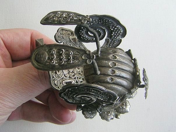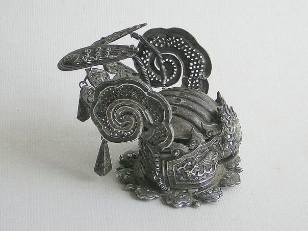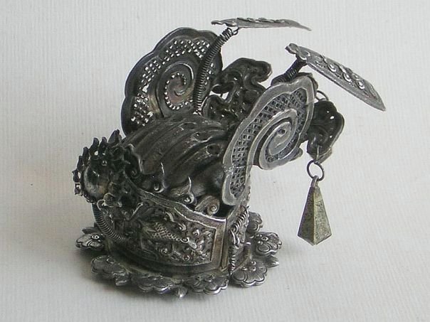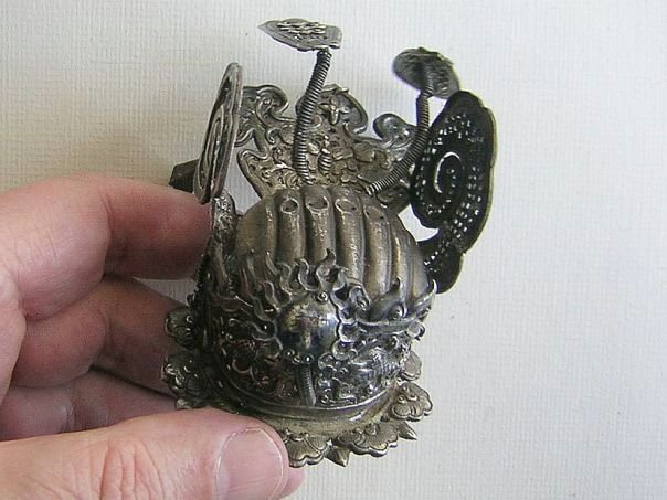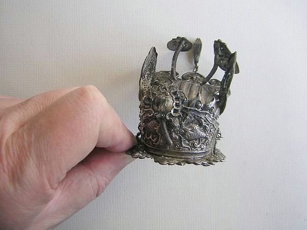 Very small embossed silver crown graced by curled up wings. We assume that this crown once graced the head of a religious statue. It is decorated with a menacing dragon that seems to be in pursuit of the ‘flaming pearl’ which is mounted on a spring in front of the creature. In China a dragon was revered as a divine mythical being and it was often portrayed chasing after a luminous pearl. In Taoism, the Dragon was seen as a symbol of Good Fortune, Strength and of Fertility as it was believed to bring rain. The mystical pearl, ringed by a fiery blaze, is often viewed as a metaphor for Wisdom and Enlightenment. Other decorations include a Butterfly (Blessings and Joy), Clouds (Granting of all wishes), Osmanthus flowers (Distinguishes sons) and a Peony (Wealth and Honor). The rim is formed by the heads of Ruyi scepters (As you wish). The very detailed crown is hallmarked with the name Heng Jie Xiang (恒洁祥) who was most probably the silversmith who made it. This rare object dates from the Qing Dynasty (1644 – 1912). Height ca 7 cm. Width 5.5 cm. Depth 9 cm.