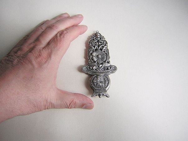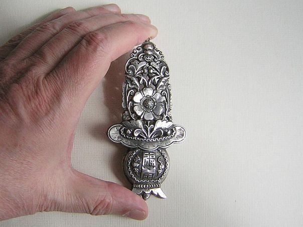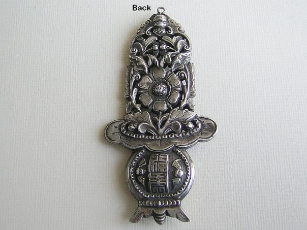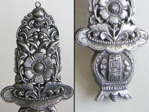 Large embossed silver ornament in the shape of a Flower Basket (Longevity & Abundance) with a Peony flower (Wealth & Honor). Hovering above is a Bat with a monstrous face. The fact that the Bat (fu) is upside down (dao) symbolizes ‘Blessings have arrived’ (fudao). On the vase are the characters Fu & Shou (福寿) which mean Blessings and Longevity. These are flanked by two more Bats (Blessings & Riches). The ornament is of exceptional quality and it is marked but the mark is illegible. We do not know its use. It dates from the late Qing period (1644 – 1912), Length 11.1 cm. Width 5.5 cm. Depth 1.2 cm.