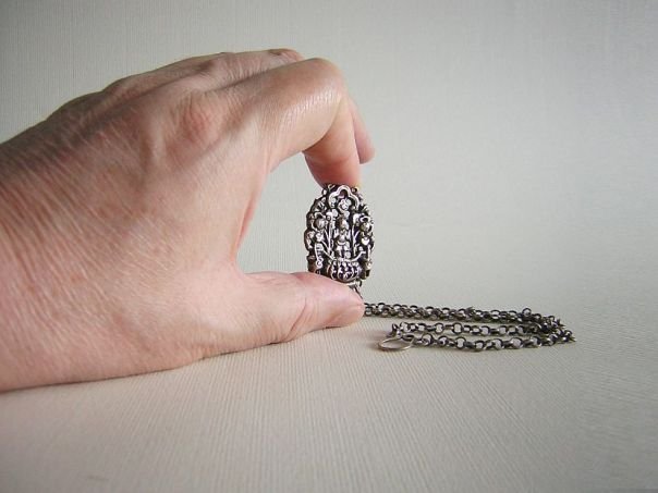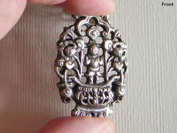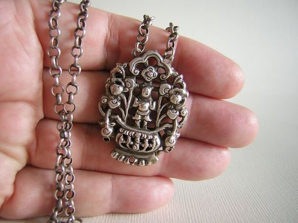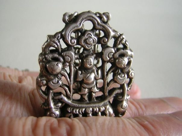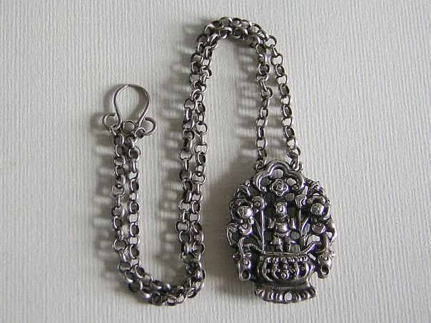 Silver necklace and solid silver pendant shaped as a Flower Basket (Longevity & Abundance) with Peonies (Wealth & Honor). A charming little figure of a baby Boy (Many Sons) stands in the centre. Above him are a stylized head of a Ruyi scepter (As you wish) and an Osmanthus flower (Distinguished sons). Both sides of the pendant are the same. It dates from the late Qing (1644 – 1912) to the early Republic period (1912 – 1947). Length including necklace 26.5 cm. Pendant height 4.2 cm. Width 3.2 cm. Depth 0.8 cm.