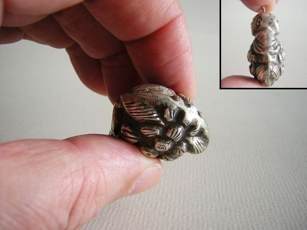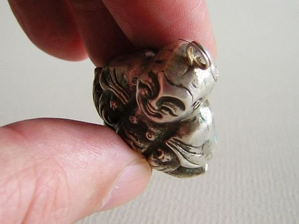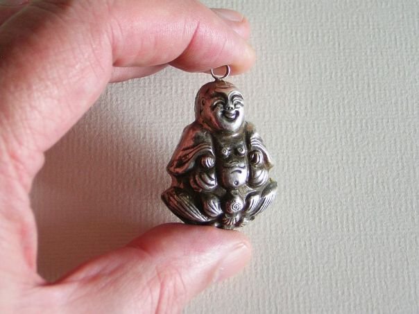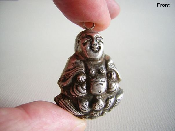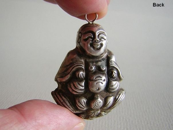 Silver pendant in the shape of the ‘Laughing Buddha’ or Putai. He has a good and loving nature and is traditionally depicted as a fat-bellied bald man wearing a robe and playing with prayer beads. He is sitting on a Lotus-shaped base which symbolizes Continuous Harmony. Putai is poor but content and his image graces many Chinese temples, restaurants, amulets, and businesses. The pendant dates from the late Qing period (1644 – 1912). Height 3.9 cm. Width 3.2 cm. Depth 2.1 cm.
