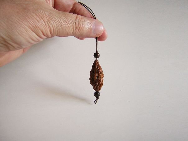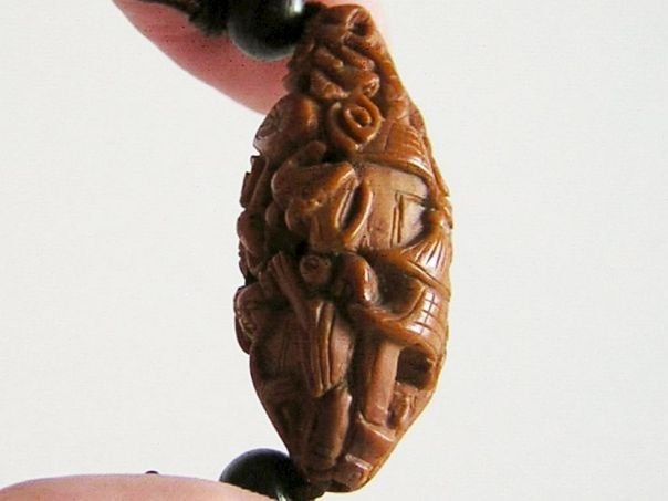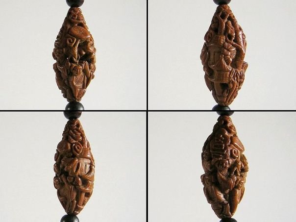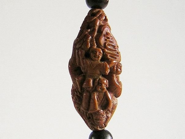 Exceptional miniature carving made from the kernel of a ‘gânlan’ fruit which is a rather hard material. Even though the carving depicts four boys, we believe that two of them are the 'Heavenly Twins' (Hehe Erxian) because one has a box in front of him and the second one holds a lotus stem in his hands. Another boy raises a ‘Ruyi’ scepter which stands for ‘ Everything you wish for will be granted’ and the fourth boy carries a sign with the character Xi (喜) or Happiness in one hand and a Gourd (Blessings & Fertility) in the other. An upside down Bat represents the saying ‘Blessings have arrived’ and Clouds symbolize the ‘Granting of all wishes’. The boys dwell in a landscape with Houses (Good Fortune & Harmony with Nature), a Pine Tree (Longevity) and Bamboo (Humility & Fidelity). All in all, this small object is full of symbolism. It was hand-carved in the latter part of the 20th century but is not signed which is normal for that period. Length 3.6 cm. Diameter 1.6 cm.