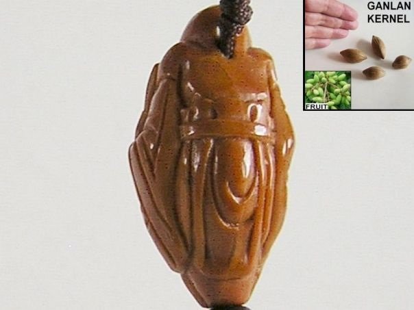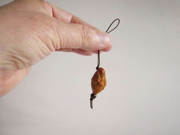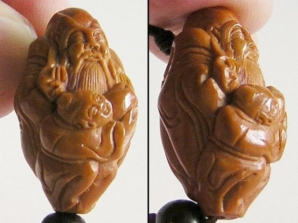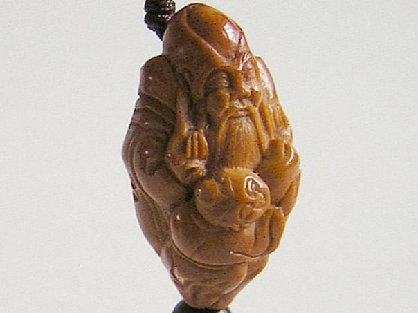 Shoulao is the God of Longevity. He is recognizable by his oversized forehead which is a sign of Wisdom, a long beard and a long staff which both stand for a Long life. In this modern miniature object he is accompanied by a small Boy who holds a Peach in his hand. Shoulao is a symbol of Longevity. The Boy represents the wish to have many Sons and the Peach is also a symbol of Longevity. The God of Longevity (Shou) is one of the Three Star Gods (San Xing) together with the God of Wealth (Lu) and the God of Prosperity (Fu). This charming little item is very nicely made but not signed. Length 3.0 cm. Diameter 1.7 cm.