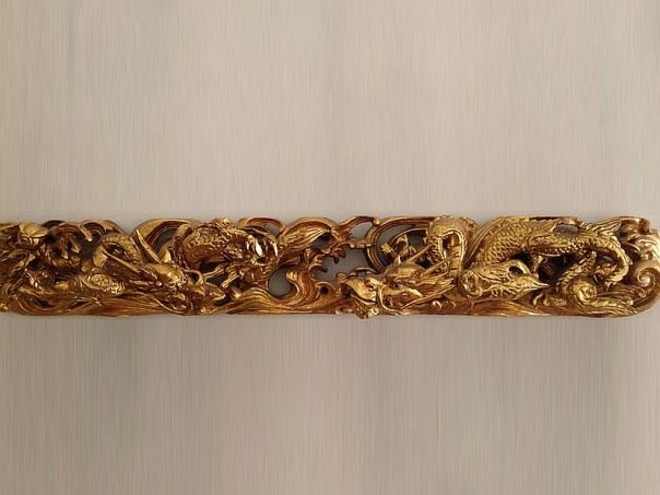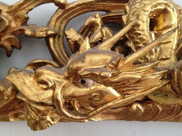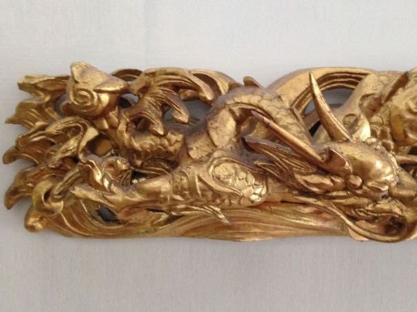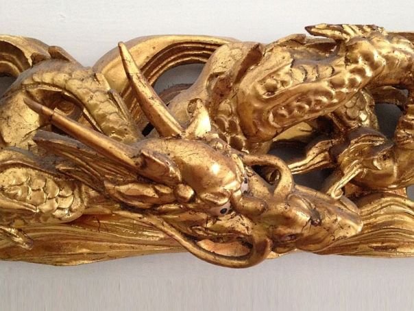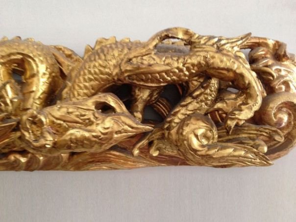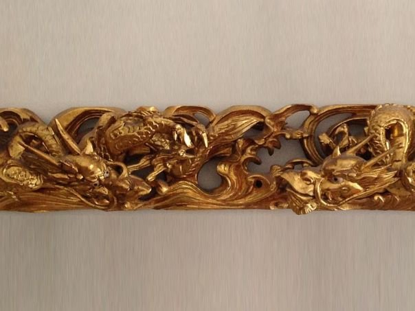 Heavily gilded openwork carving of two dragons chasing a ‘flaming pearl’. In China and Japan, dragons traditionally symbolize auspicious powers, particularly control over water, rainfall, typhoons, and floods. The dragon is a symbol of power, strength, and good luck for people who are worthy of it. The ‘flaming pearl’ is associated with spiritual energy, wisdom, prosperity, power and immortality. This gilded panel originally formed part of a ‘Butsudan’ (佛壇) which is a Buddhist shrine commonly found in homes in Japan. A ‘Butsudan’ is a lacquered wooden cabinet with doors that enclose a religious icon which may be a statue or a painting of a Buddha or Bodhisattva, or a mandala script. The panel dates from the Meiji period (1868 – 1912) and was found by friends of ours in Japan. Length 62 cm. Depth 6 cm. Height 10 cm.